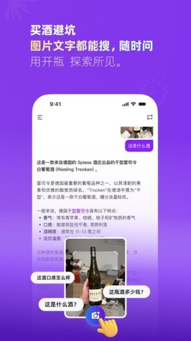 2、AI品酒顾问全天候在线,用文字或图片提问都能得到专业解答。