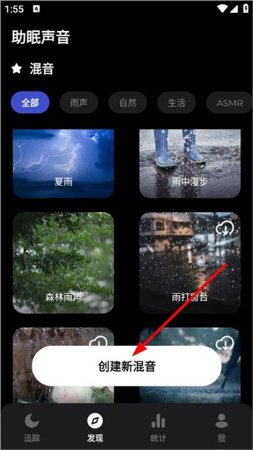 在【发现】页面中,提供多种助眠音效分类,如雨声、自然白噪音、生活环境音、ASMR 等;选择你喜欢的声音类型,然后点击【创建新混音】开始自定义组合。