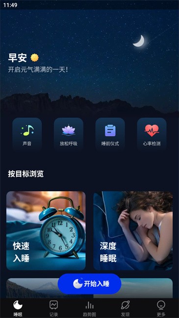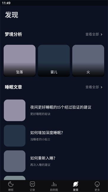 4、睡眠过程中应用会自动记录身体移动和环境声音,清晨醒来后查看生成的睡眠分析报告。