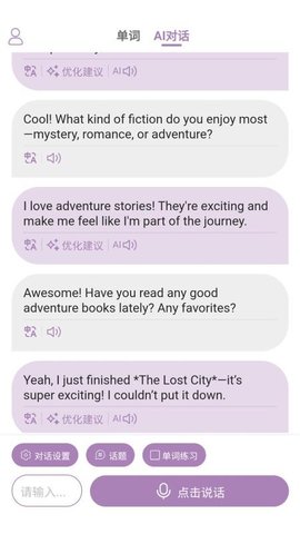 2、对话练习模块采用主动输出模式,通过构建真实对话场景巩固所学词汇。