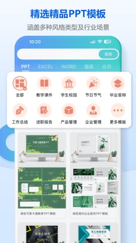 小Q模板是一款办公模板工具,的核心优势在于模板种类多、更新速度快且操作简单。内置了大量高质量的PPT、Word、Excel模板以及海报素材,各类资源不断上新,方便你快速找到想要的样式。你可以随时对模板进行编辑和调整,不需要复杂的设计技能,就能轻松做出满意的办公文档,大大节省制作时间,让PPT等文件的准备过程变得轻松高效。