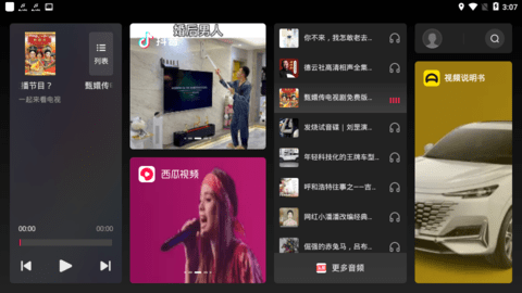 1、启动车载系统后,打开火山车娱应用,主界面会显示音乐、视频和新闻等分类选项。