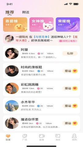 兰友是一款同城陌生人社交应用,集合了定位匹配、多媒体互动和话题社区等多种元素。在地铁通勤时滑动附近用户列表,午休时间参与热门话题讨论,深夜通过语音连麦结识兴趣相投的伙伴,这些场景都能在应用中自然呈现。动态广场实时更新同城生活片段,视频中心展示用户原创内容,装扮系统让个人主页更具辨识度,形成完整的社交闭环。