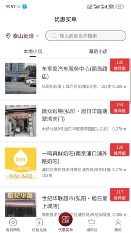 3、本地小店优惠模块基于LBS定位,自动筛选周边500米内支持积分抵扣的餐饮店铺。