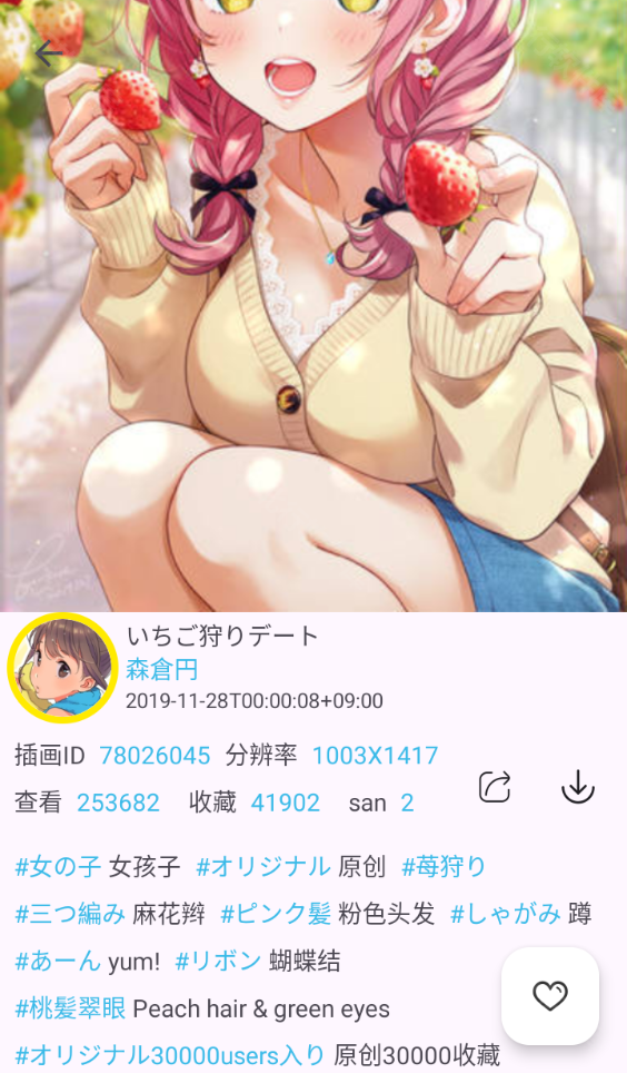 1、打开应用后,在主界面滑动浏览推荐的插画作品,点击任意作品可进入详情页面。
