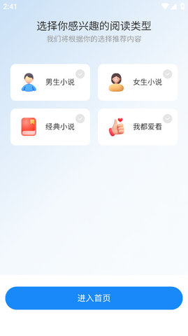1、首次打开应用时,系统会引导选择感兴趣的题材标签,这些信息将用于初始内容推荐。