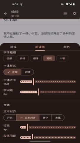 3、进入阅读界面后,点击屏幕中央调出设置菜单,调整字体大小和背景颜色。