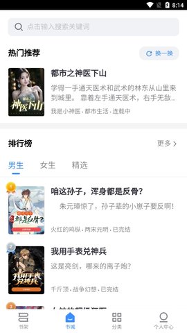 1、打开应用进入书城主界面,浏览热门推荐、分类浏览、榜单排行和个性化推荐四个主要板块。