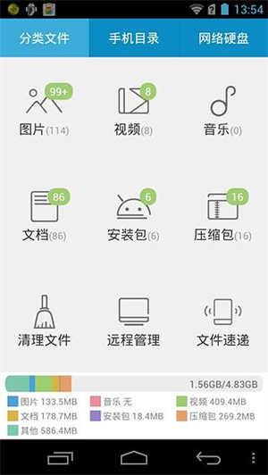 打开软件后,首页会直接显示当前文件数量和剩余存储空间。