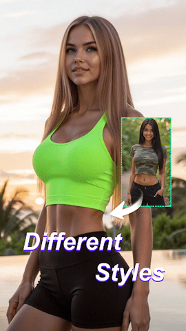 1、转换后的作品自动匹配色彩方案,服装纹理与背景元素和谐统一。