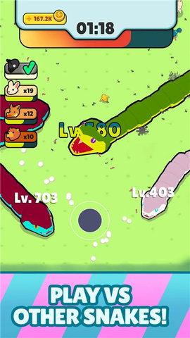 1、正义之蛇的成长系统极具深度,吞噬不同食物会触发特殊效果,比如金色能量球能暂时提升移动速度,红色浆果则能增强撞击力。
