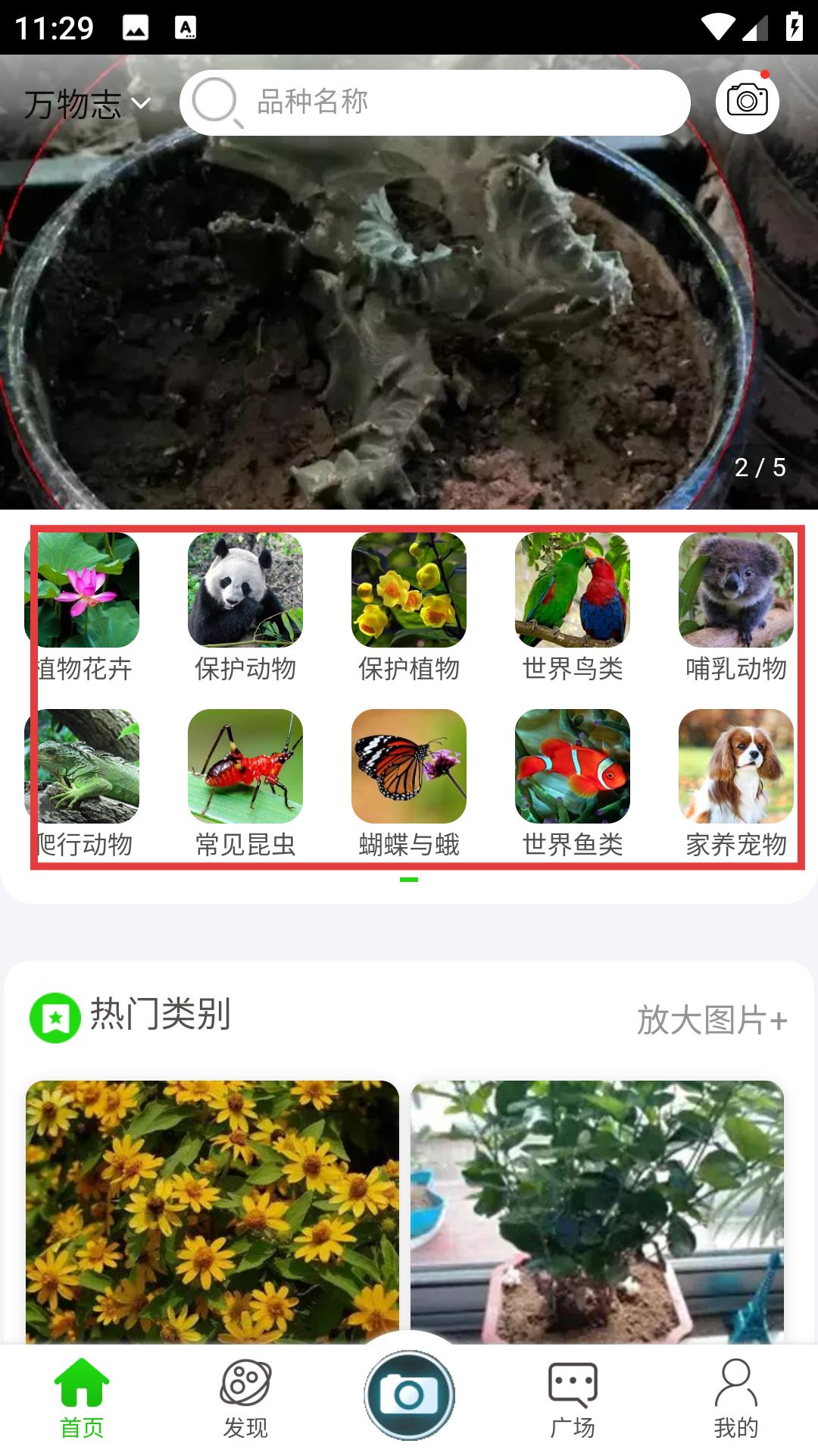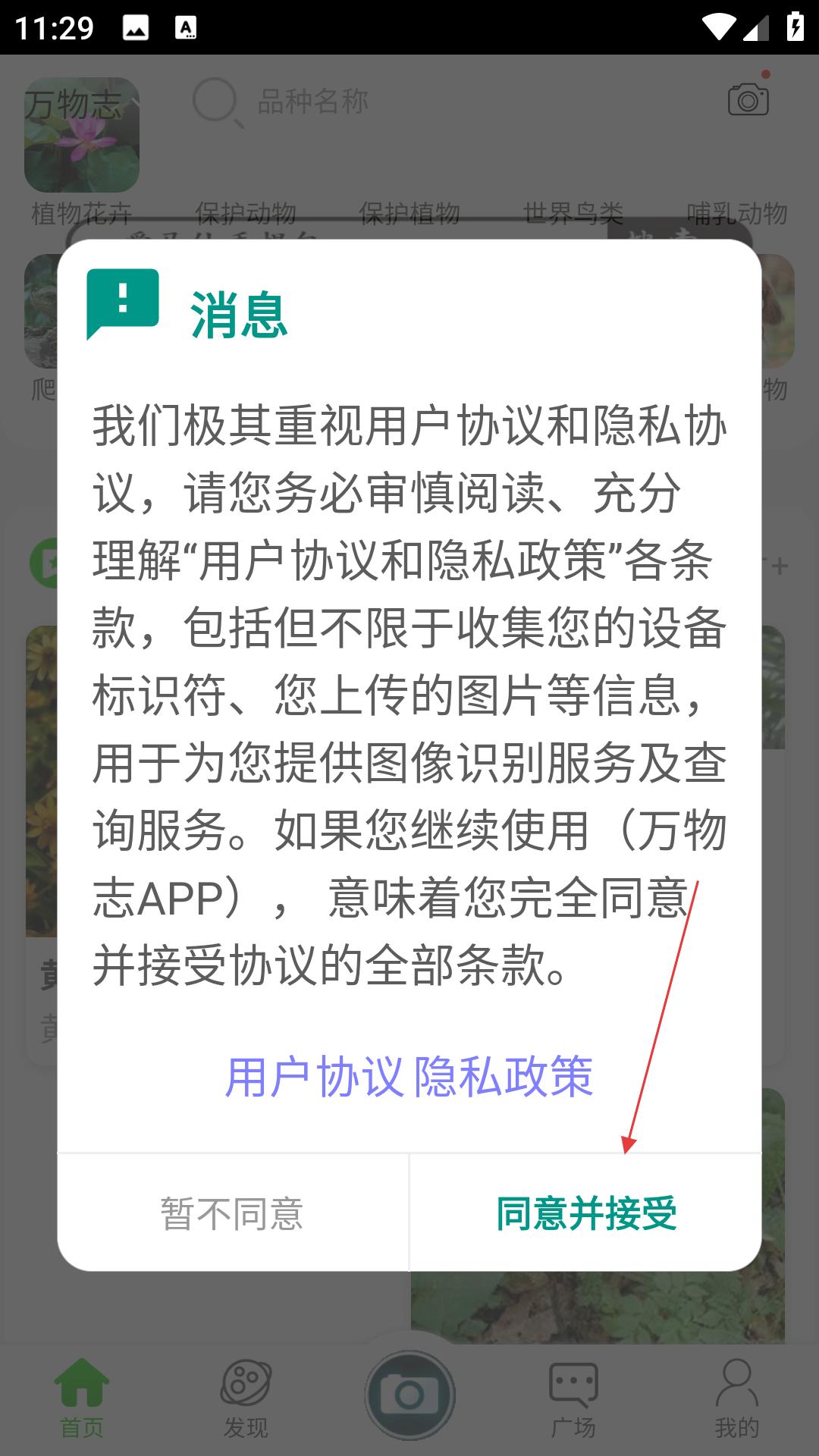 2、在协议页点同意,进主界面,用搜索找品种,看热门类别,上传图片,识别生物,助力学习。