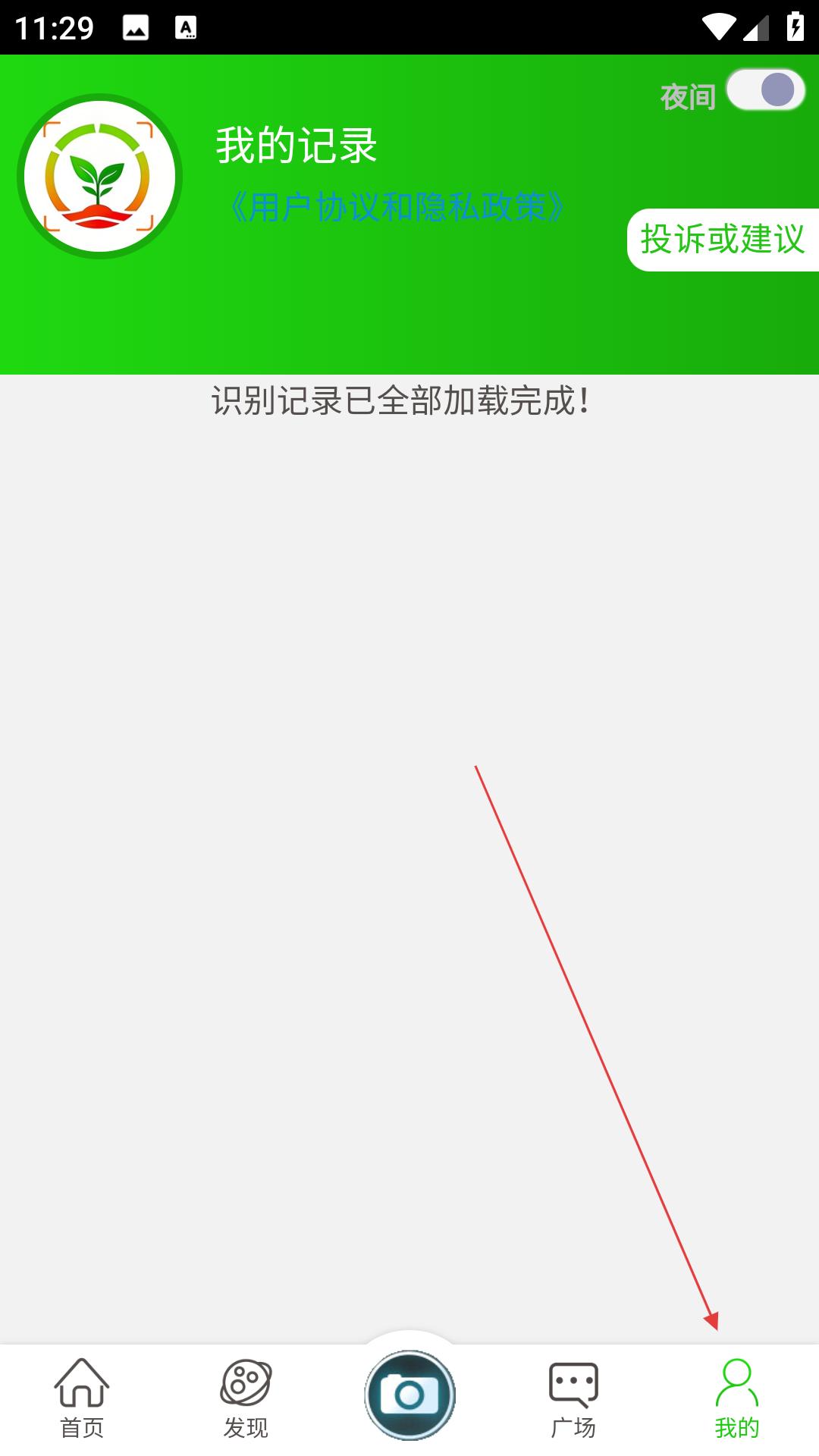 3、点我的,查识别记录,管理投诉建议,切换夜间模式,阅读协议,保障使用体验,记录探索。