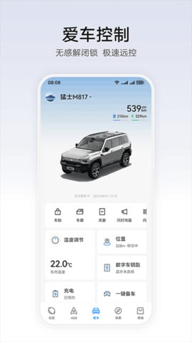 1、车辆远程控制支持提前开启空调制冷,夏季上车即可享受舒适温度,无需忍受车内高温煎熬。
