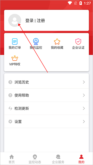 首次使用时,请进入应用【我的】页面,点击左上角头像图标(见下图红色箭头所示区域)。