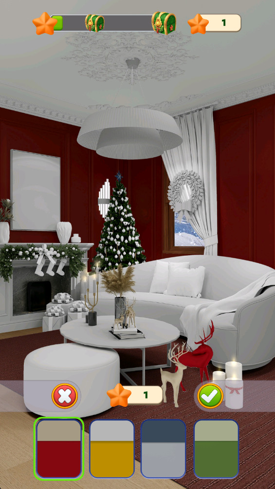 圣诞家居设计是一款让你在雪花飘落的季节里亲手打造梦想家园的奇妙游戏,将经典的三消乐趣与温馨的家居装饰完美结合,每一关都像拆开一份圣诞礼物般充满惊喜,当你通过智慧解开色彩斑斓的谜题时,不仅能收获满满的成就感,还能用赢来的星星点亮壁炉、挂起铃铛,让空荡荡的房间逐渐变成闪着金光的童话世界,从无到有的创造过程,仿佛在冬日里编织属于自己的温暖记忆。