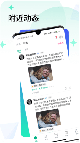 1、动态信息流展示附近用户的实时分享,随时发现有趣的内容和潜在的朋友。
