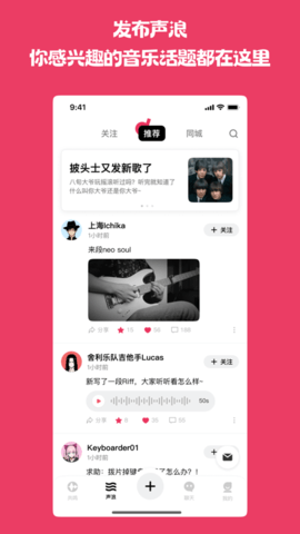 奏浪是一款融合音乐欣赏与社交互动的创新平台,让声音成为人与人之间的沟通桥梁。打破了传统音乐应用的单一模式,将聆听体验与社交发现有机结合,创造出独特的音乐共鸣空间。每段旋律都能引发深度交流,每个音符都可能开启新的友谊。平台注重声音质量的呈现,营造出温馨的社区氛围,让音乐爱好者找到属于自己的声音天地。