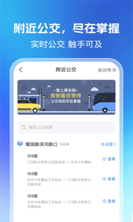 3、根据当前位置智能推荐距离最近的乘车点,显示经过该站点的所有线路及其运行方向。