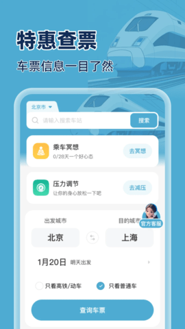 火车特惠搜是一款整合了车票查询与出行服务的移动工具,能够实时获取列车班次信息和票价动态。可以根据出行偏好筛选合适的车次,提供车站周边导航服务。在行程规划方面,工具会及时推送各类出行提示,让使用者随时掌握行程变化。不管是日常通勤还是长途旅行,都能获得完整的出行方案参考。