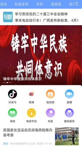 1、首次打开奇美南丹,主界面会分栏展示推荐新闻、本地视频和活动信息,上下滑动可以浏览不同板块的概要。
