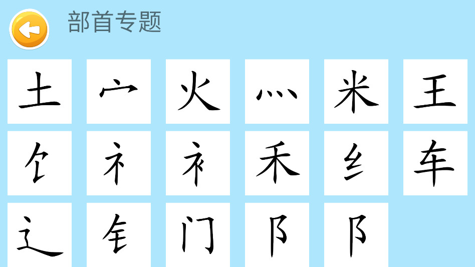 2、汉字卡片功能汇总了所有学过的字,可以随时点击复习,回顾发音、笔顺和组词示例。
