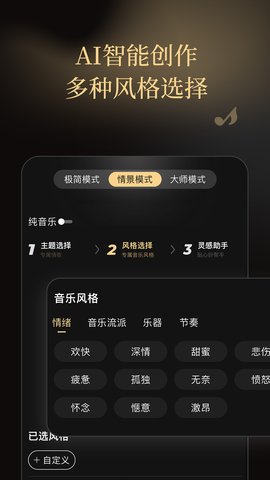 2、在风格选择页面浏览不同的音乐类型,点击心仪的风格后可以预览该风格的代表性作品片段。