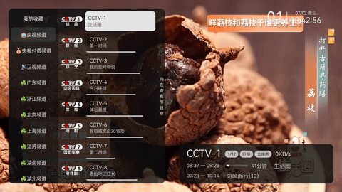 1、成功启动软件后,您会看到按不同类型划分的频道分类列表,例如央视、卫视、影视轮播等,通过遥控器方向键可以浏览并选中想看的分类。