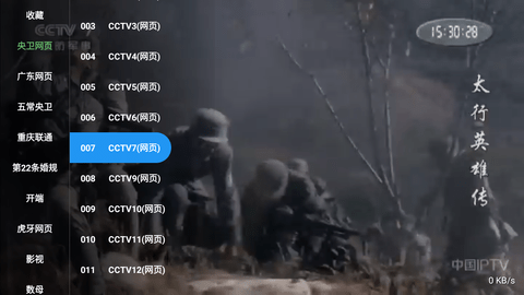 1、成功启动软件后,你会看到按不同类型划分的频道分区,例如央视、卫视、影视等,使用遥控器方向键可以浏览这些分类。