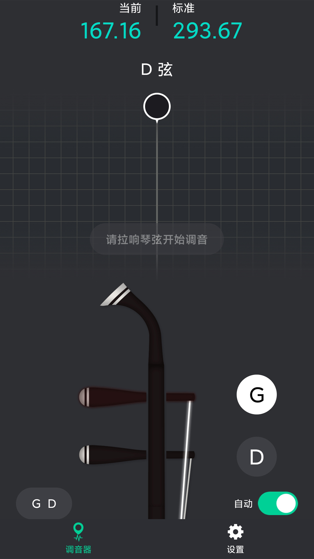 3、拨动内弦(D弦),观察屏幕上指针的移动方向,指针偏左表示音偏低,需逆时针微调琴轴。