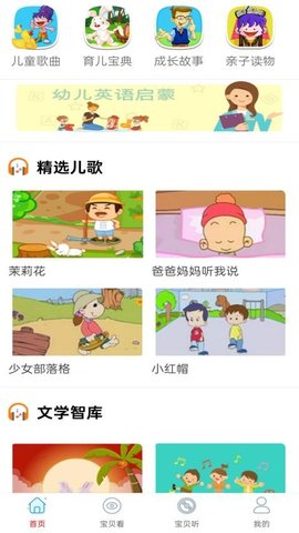 1、首页会以卡片形式展示儿歌、故事、国学、动画等核心板块,左右滑动可以浏览不同类别下的热门推荐。