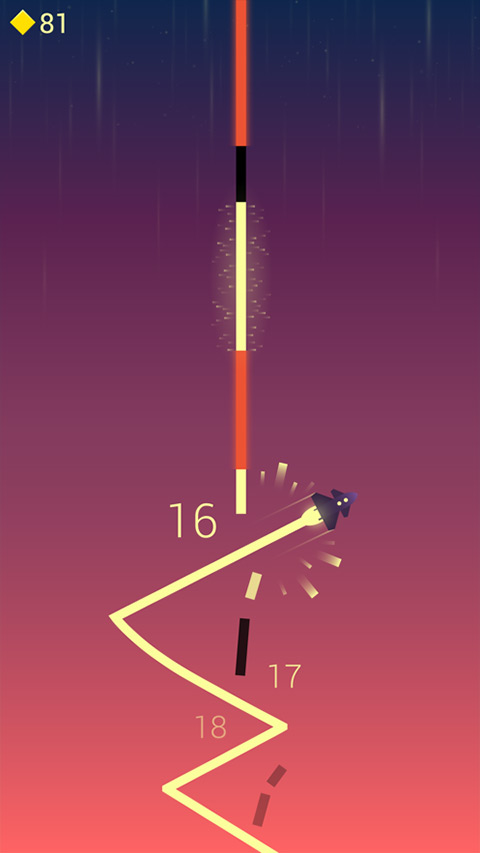 击碎线条是一款以极简几何美学构建的飞行穿梭游戏,玩家通过单次触控引导飞行器在充满色条的通道中精准转向,每一次成功的穿越不仅带来得分的累积,更在视觉与听觉上营造出独特的解压韵律。