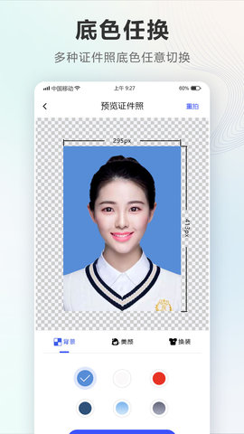 1、根据需求自由选择并更换照片的背景颜色,例如标准的红色、蓝色或纯白色背景。