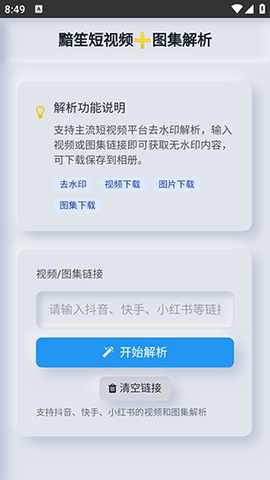 1、软件主界面清晰地划分为不同区域,分别对应短视频与图片集合的分析入口。