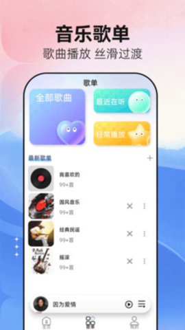 1、自由创建属于自己的播放列表,并对列表进行便捷的管理,导入歌曲后便能立即开始欣赏。