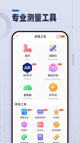 AI长度测量是一款手机测量工具,它让日常的尺寸估算变得简单直接,只需打开软件,就能将手机屏幕转化为一把实用的尺子,不管是想量一下书本的宽度,还是家具的大致长度,都能快速得到参考数据,整合了其他实用小工具,方便在需要时切换使用。