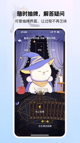 2、抽牌与宠物互动的界面设计得生动有趣,配合灵动的动画效果,让整个探索和沟通的过程充满了轻松愉快的氛围。