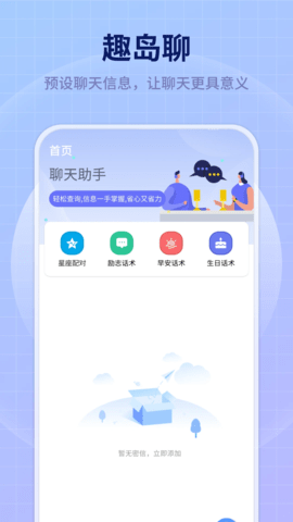 趣岛聊是一款融合了社交互动与创意表达的数字工具,围绕星座话题展开交流,整合了多种内容创作辅助模块,让日常沟通与自我展示都变得更加生动有趣,软件的设计理念注重实用性与情感连接,为使用者提供一个既能轻松对话又能自由创作的线上空间。