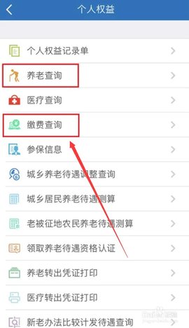 3、在个人权益页面中选择缴费查询选项,系统便会展示出用户历史的社会保险缴费明细列表。