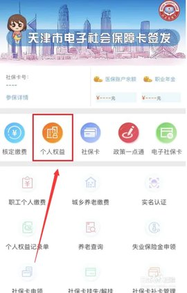 2、在主界面找到并点击个人权益功能入口,这里集中了与个人账户相关的各类信息查询服务。