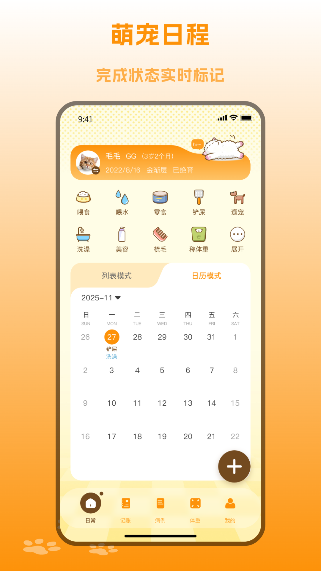 2、日常事项记录支持多达22项的场景设置,主人可以根据自己的需求选择列表或日历模式进行查看。