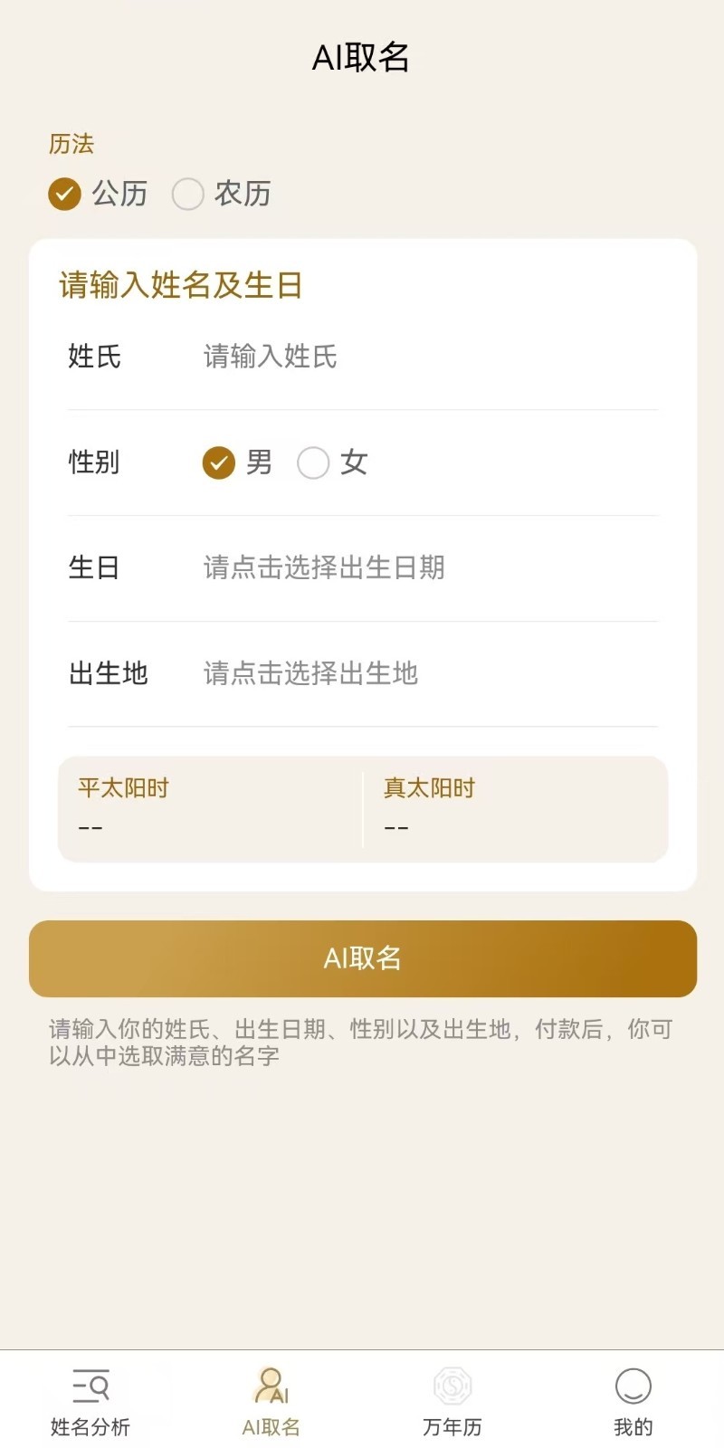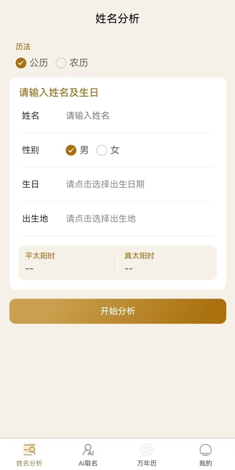 2、输入相关的基本信息,包括姓氏、出生日期等,以便进行个性化分析。
