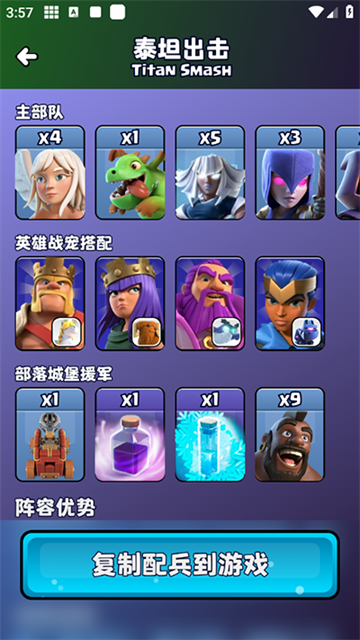 2、提供多元化的阵型选择,包括资源掠夺、部落战和奖杯冲榜等场景。