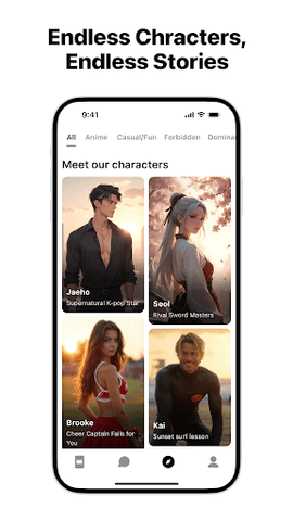 2、在主界面的Meet our characters板块,浏览上百个预设角色,找到心仪的角色后,点击其头像即可进入互动页面,开始与角色的交流。