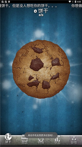 1、进入游戏后,玩家需要疯狂点击屏幕中的大饼干,以便收集曲奇小饼干,积累资源是游戏的基础。