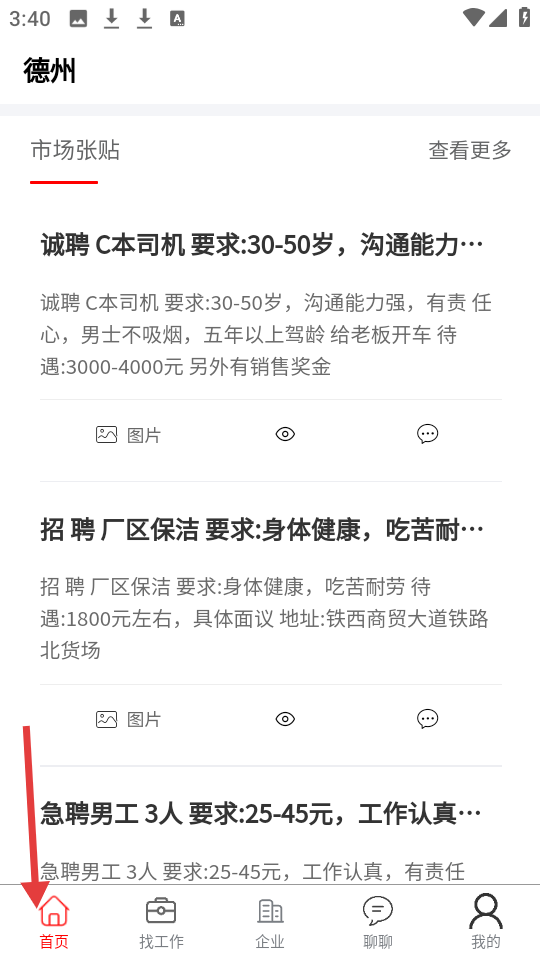 首页展示德州地区的招聘信息,包括C本司机、保洁等岗位,并明确标注薪资待遇。点击【查看更多】可开启更多求职选择。