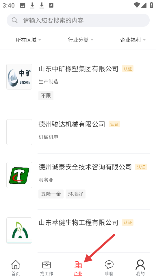 企业页面展示了多家公司信息,例如山东中矿橡塑集团,详细标注了行业类型、福利待遇及认证状态,方便求职者全面了解企业背景。