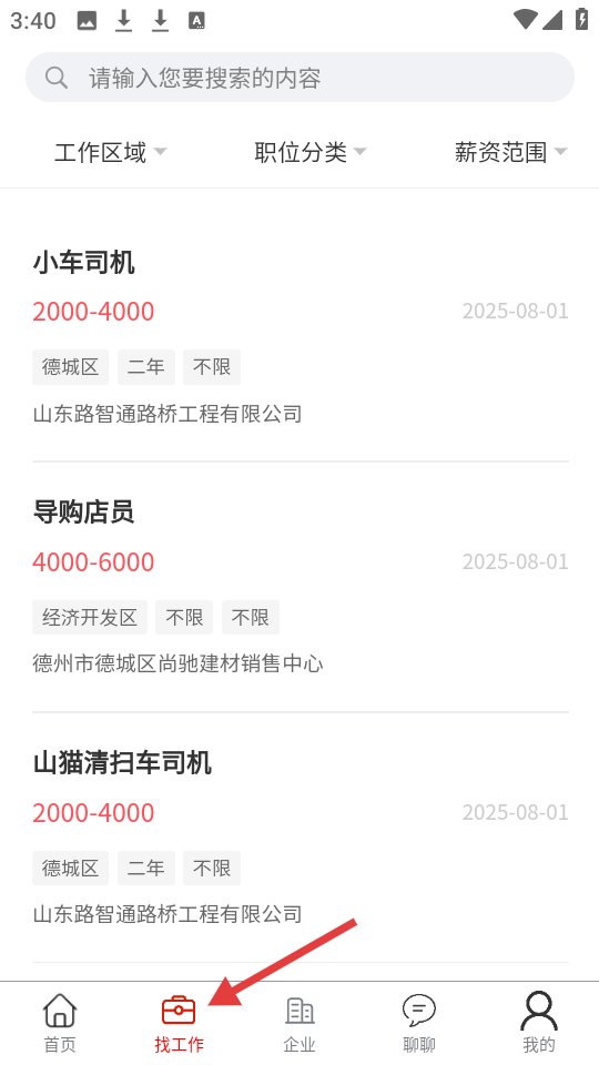 在“找工作”页面,罗列了多种岗位,如小车司机、导购店员等,详细列出薪资和工作区域,并支持条件筛选功能,帮助您快速找到合适职位。