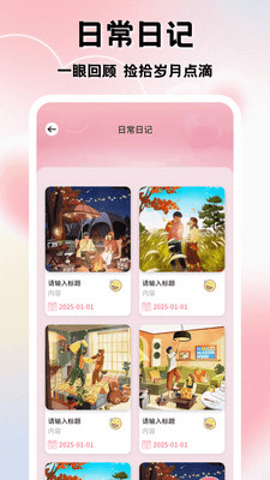 1、方便地添加恋爱日记,记录下与爱人相处的每一个瞬间,确保每次相聚的美好时光都能被铭记。