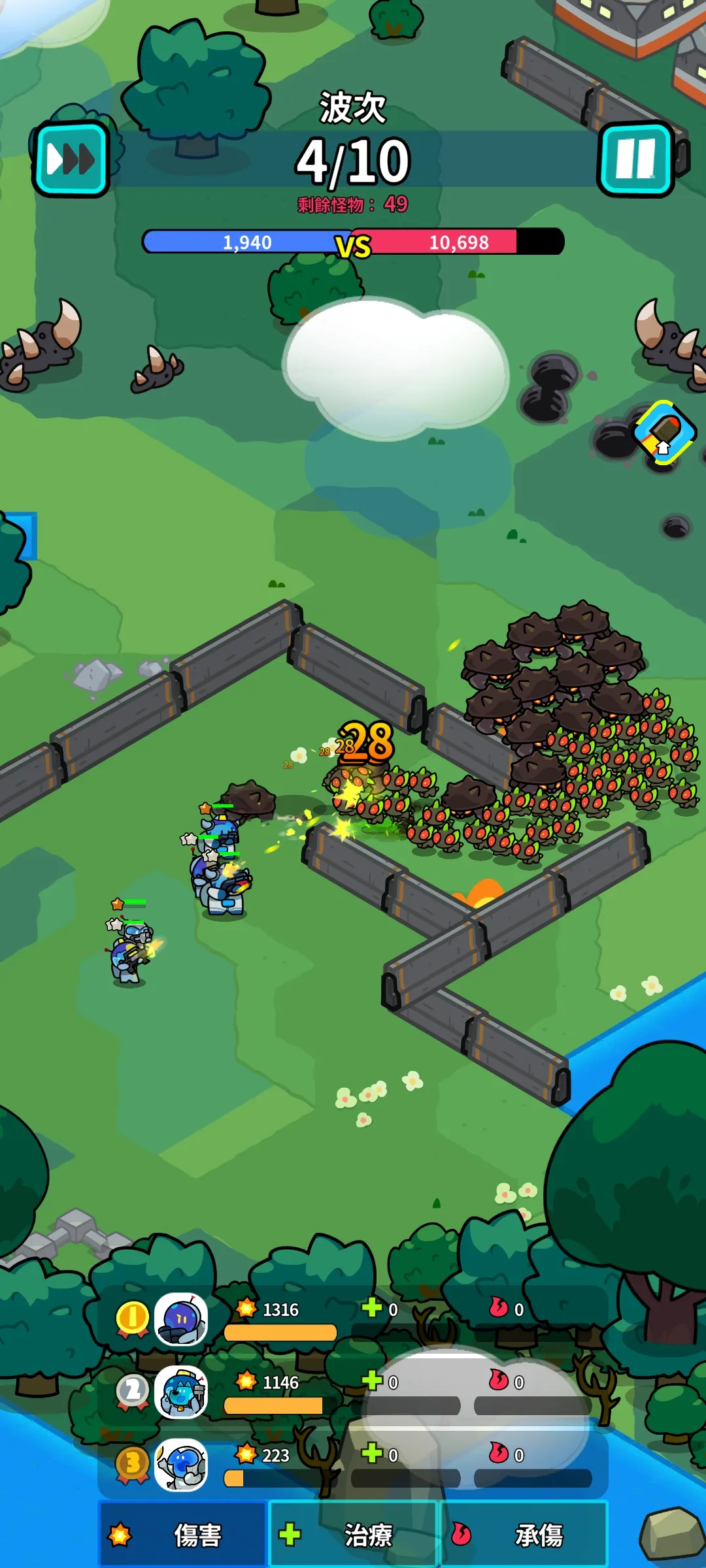 2、在每场战斗开始之前,玩家需要根据敌人的类型和波次,合理选择和部署英雄,确保防线稳固。